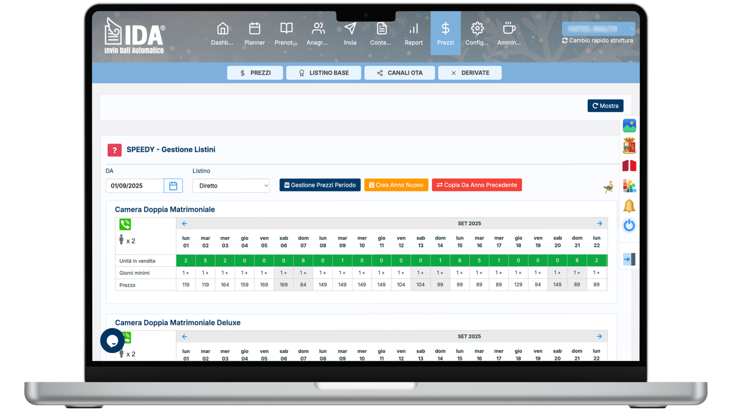 La sezione Prezzi del gestionale IDA permette di gestire in modo centralizzato tutti i listini destinati ai diversi canali OTA, consentendo di impostare, modificare e aggiornare rapidamente le tariffe secondo le esigenze operative. Grazie a un’interfaccia intuitiva, è possibile aprire o chiudere la disponibilità delle camere, aggiornare i prezzi in tempo reale e garantire che tutte le variazioni vengano propagate automaticamente ai canali collegati. Questa gestione centralizzata riduce gli errori manuali e semplifica il controllo su aperture, chiusure e aggiornamenti dei listini, ottimizzando l’efficienza nella gestione della struttura.