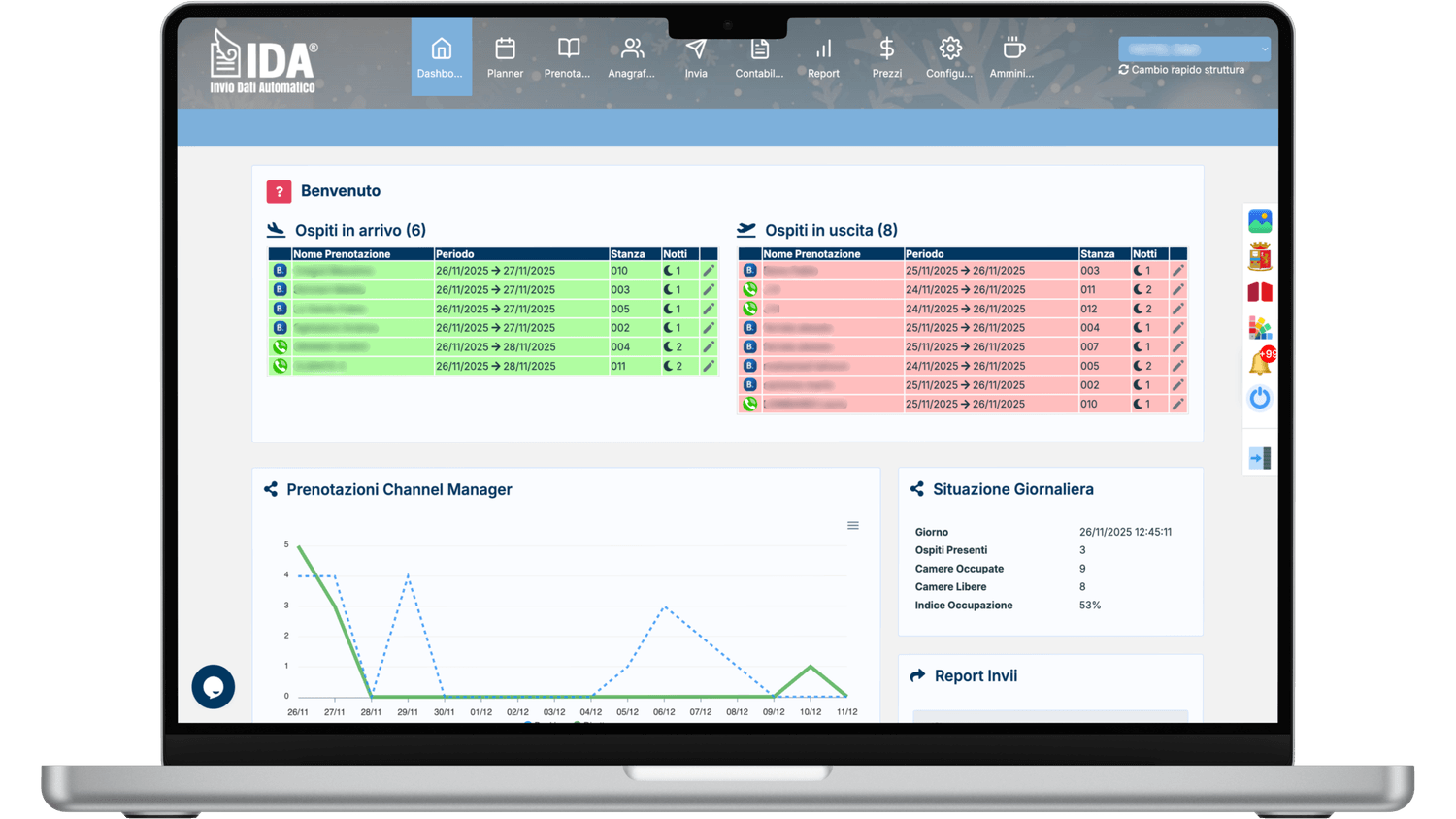 La dashboard di IDAWED offre una panoramica immediata e completa sull’andamento della struttura nel periodo, mostrando in modo chiaro dati come occupazione e performance generali. Nella stessa schermata sono visibili anche gli ospiti in arrivo e in partenza, insieme all’andamento giornaliero delle prenotazioni, così da avere sempre sotto controllo il flusso operativo e lo stato attuale della struttura. È uno strumento rapido, intuitivo e pensato per fornire tutte le informazioni essenziali in un unico colpo d’occhio.