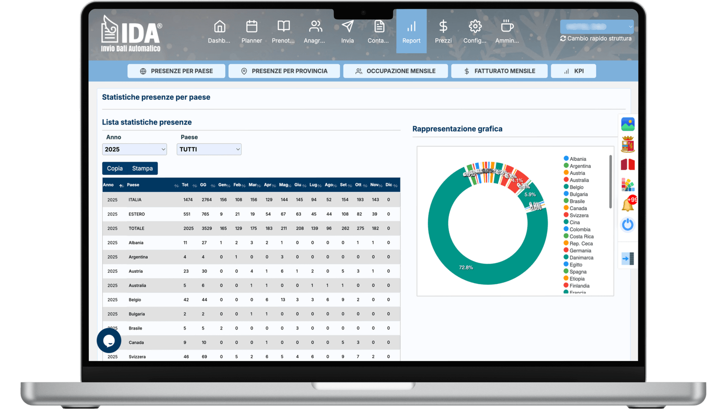 La sezione report mostra in maniera chiara le presenze suddivise per paese, evidenziando quanti ospiti provengono da ciascuna nazione. I dati sono rappresentati sia in forma tabellare, con numeri precisi, sia attraverso un grafico visivo che consente di confrontare rapidamente le presenze relative tra i vari paesi. Il grafico fornisce immediatamente un colpo d’occhio sull’andamento delle presenze. In questo modo la sezione permette di monitorare facilmente la distribuzione geografica dei partecipanti e di trarre insight utili per analisi successive o reportistica dettagliata.